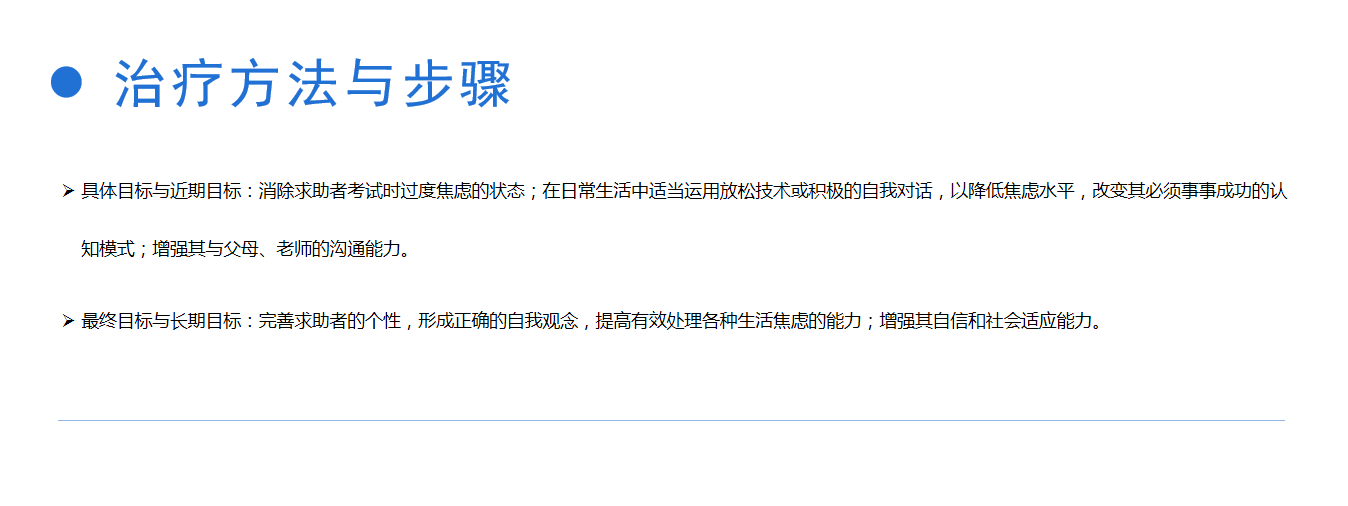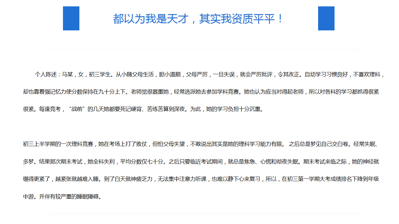 摘要:本文是對(duì)一例考試焦慮女中學(xué)生進(jìn)行咨詢的案例報告,主要采用了放松訓練、系統脫敏、認知重建、積極自我暗示等治療技術,使其改變完美主義認知傾向(xiàng),建立自信,消除考試中的過(guò)度焦慮。并對(duì)咨詢效果進(jìn)行了回訪、跟蹤與評估,屬成(chéng)功咨詢案例。