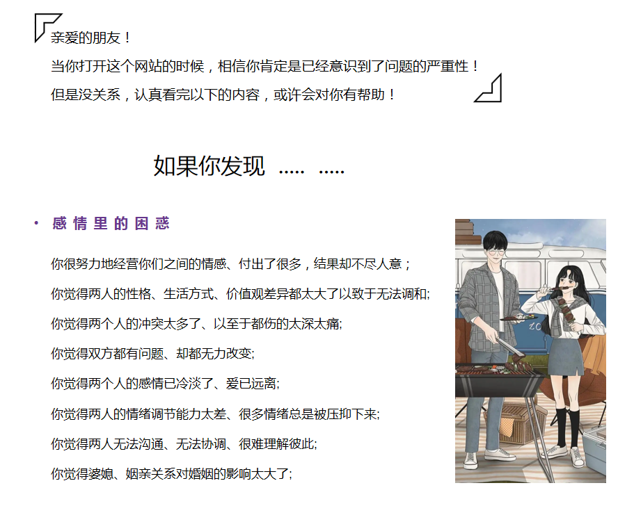 如果你們之間的愛情,經(jīng)常争吵、不忠、出軌、憤怒、無法溝通,無法相處,變得彼此傷害,被(bèi)時(shí)光磨的平淡如水,沒(méi)有熱情和活力,矛盾重重無法調解,積壓情緒無法釋放,兩(liǎng)個人走向(xiàng)分手的邊緣。不要再等了,趕緊來找我們尋找專業的幫助吧!